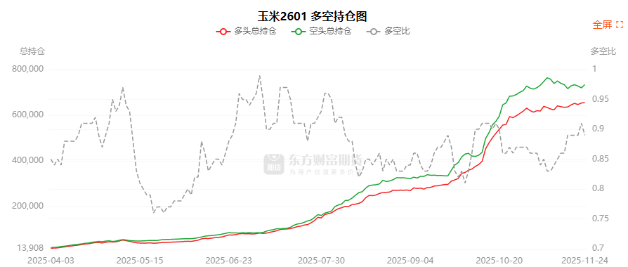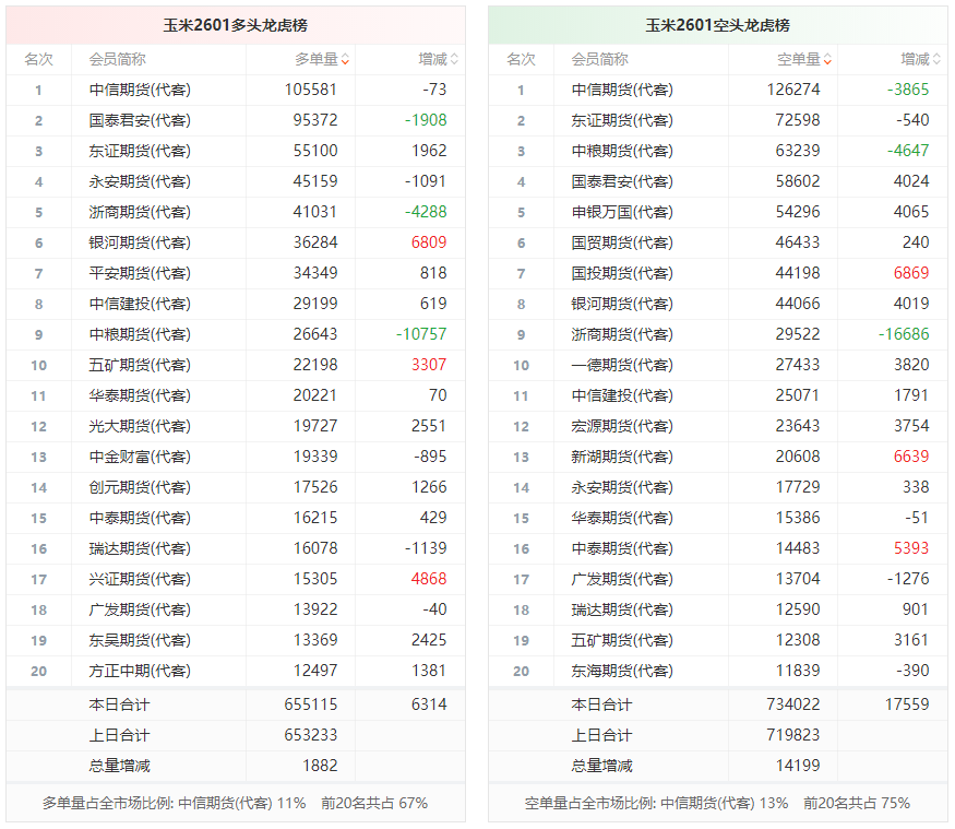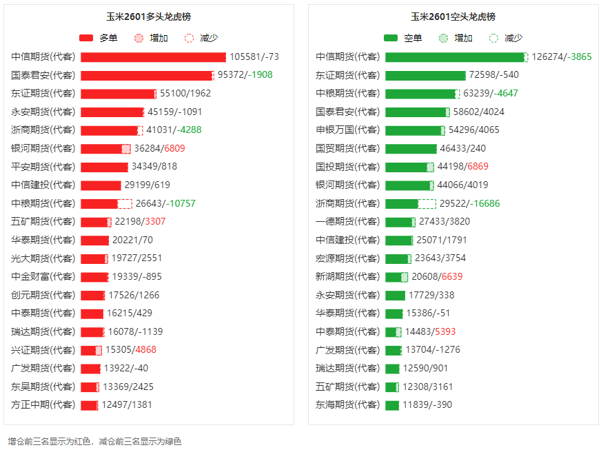 总体而言,玉米2601合约今日增仓上行,多空持仓排名前20席中,多空双方均呈进场态势,多头进场意愿弱于空头。