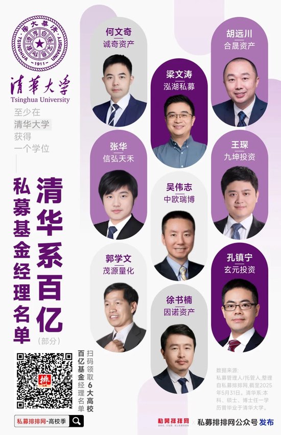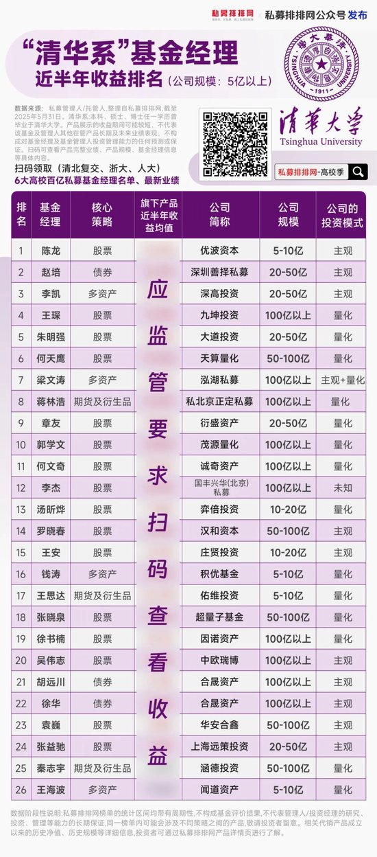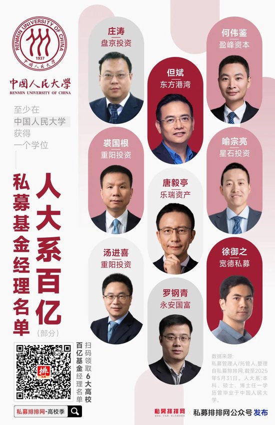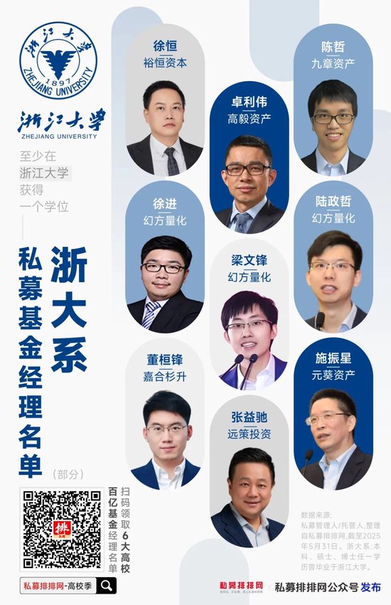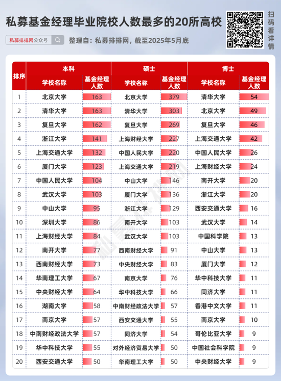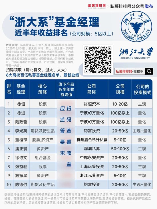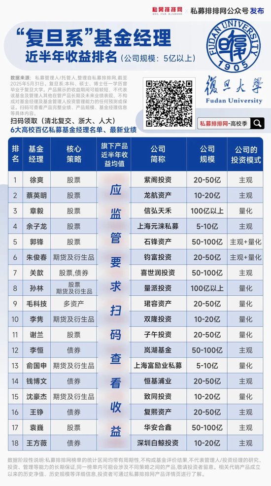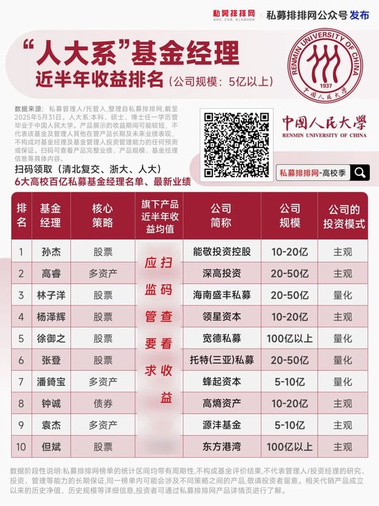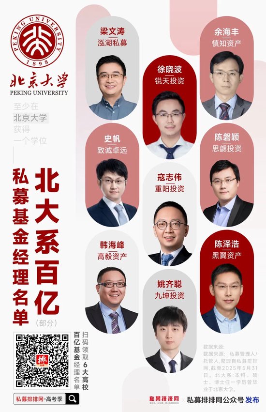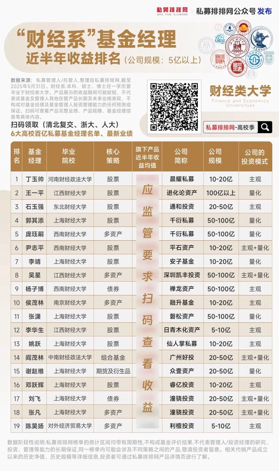 根据私募排排网数据,截至2025年5月底,在私募排排网有3只以上私募产品有近半年业绩展示且符合排名的基金经理共有495位。为了给读者提供一些参考,笔者分别梳理出了毕业于“北京大学、清华大学、复旦大学、上海交通大学、中国人民大学、浙江大学、国内财经院校”且有近半年业绩显示的私募基金经理(公司规模在5亿元以上)。
