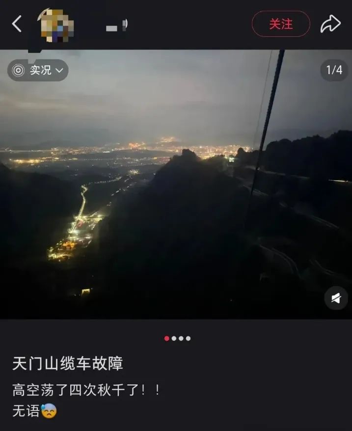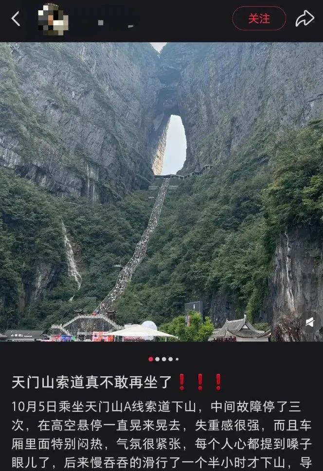 10月6日,多位网友在社交平台反映称,10月5日晚,在湖南张家界天门山景区乘坐索道缆车时被困。有游客吐槽当时被困轿厢悬在半空中1个小时,还有游客表示,运行过程中索道多次停顿,人仿佛在高空中“荡秋千”。