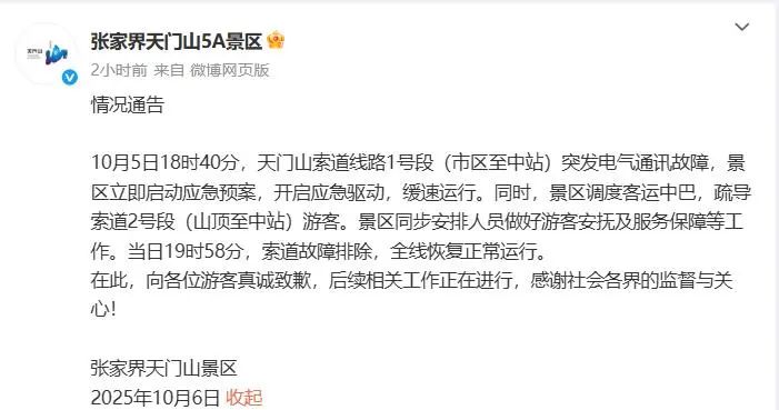 10月6日,@张家界天门山5A景区就此事发布了情况通报。